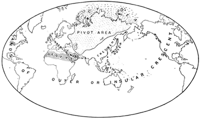 área pivote que es el centro geográfico de la mayor agregación de recursos naturales del planeta (la Isla Mundo), en capas sucesivas cara al exterior tenemos el creciente interior o marginal y el creciente exterior o insular.